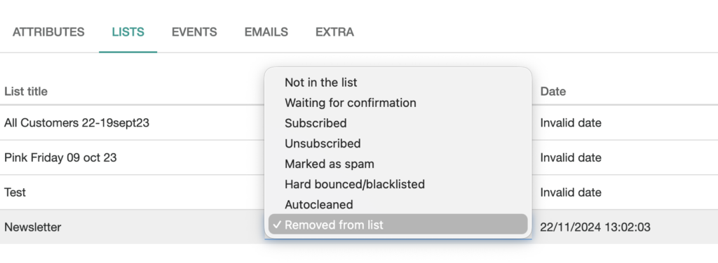 We recommend using “removed from list” instead of “unsubscribed” to keep tracking of being removed manuall.y